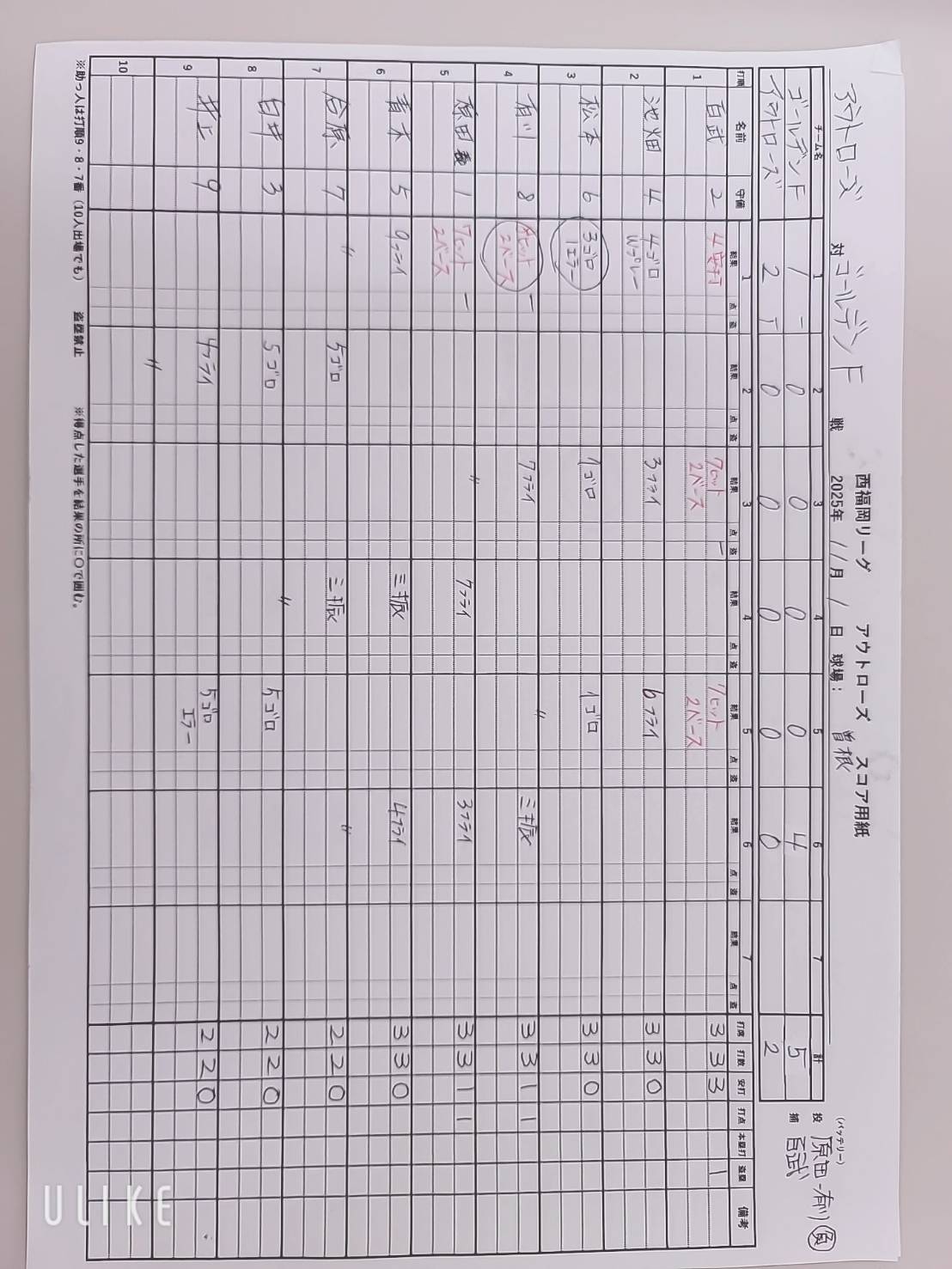 先攻スコアブック 後攻スコアブック